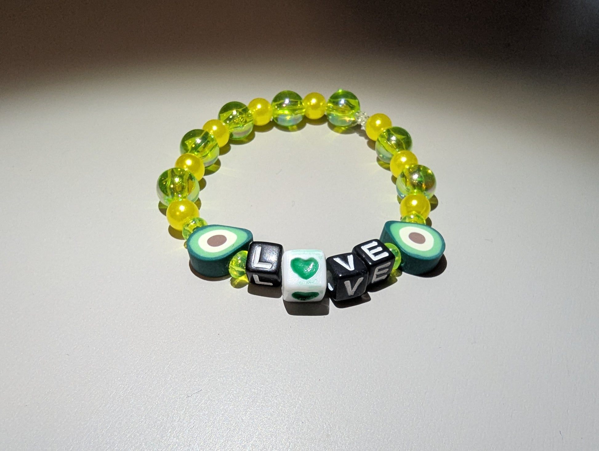 Dit vrolijke armbandje is een echte eyecatcher met zijn frisse kleuren groen, geel en zwart. De schattige avocado-bedel en de kraaltjes met het woord love maken 'm superlief Γ©n helemaal on-trend!